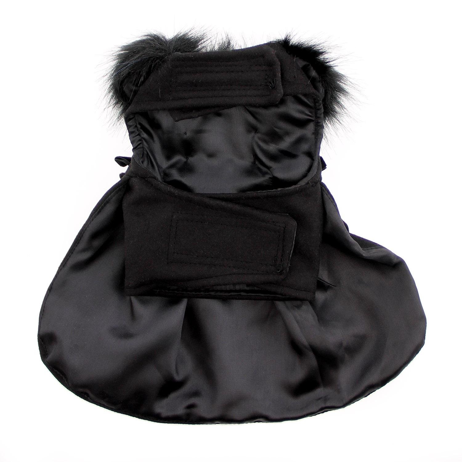 Black wool coat with black faux fur collar, fully lined. Comes with D-Ring and matching leash. It features two classic buttons and two satin ribbons.