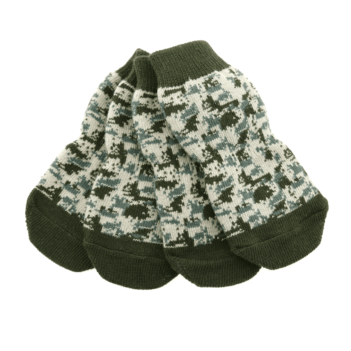 Our socks are made with 100% cotton and available in 4 great prints; Argyle, Camo, Pineapple, and Hearts. They are made of a very soft cotton and feature an anti-slip dog sole.